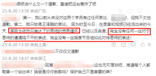 借用某位上海网友的评论“周菲戈依然只表达了对恩师的感恩缅怀,以及自责,完全没有任何一丝对于恩师的遭遇鸣不平的表述,完全没有一丝指责节目组如此对待恩师的表述!”