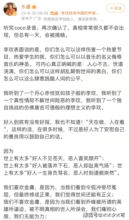8月20日,知名主持人乐嘉也就Coco录音事件发表了自己的看法,乐嘉说他听到了一个丹心赤忱犹如孩子般的李玟,听到了一个真性情却不解世间险恶的李玟,听到了一个独自挑战的仿佛唐吉可德般的理想主义的李玟,这也是截止到目前,第一个敢发长文看待李玟事件的圈内艺人。