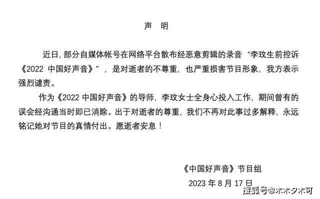 一位出道了28年的中国歌手,在很多重要场合支持自己的国家,多次投身公益活动,22年10月在《中国好声音》为了让学员有一个公平的赛制忍受着浙江台工作人员的侮辱甚至动手,把她的尊严在地上摩擦,李玟这段录音叫不醒装睡的娱乐圈,大多数艺人害怕得罪节目组,当初的高以翔事件同样如此,命都搭上了,蓝台依旧不倒,就目前而言,王泽鹏,周菲戈,包括乐嘉,能公然出面发声,属于一个好的开始,希望后续李玟能真正等到一个公道,虽然她已经离去,但正义,真相的到来,会让民众觉得这个世间多半还是存在美好的。