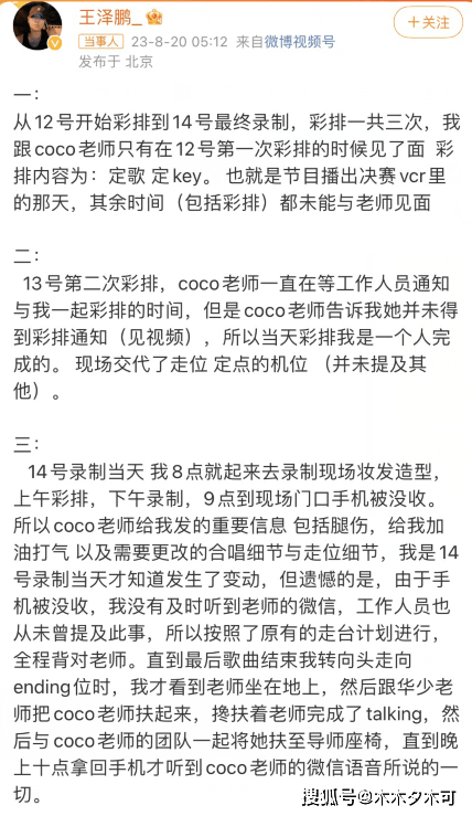 周菲戈发文称对不起李玟老师,要不是因为他,或许李玟就不会遭遇后面一系列与节目组不愉快的的事情,而王泽鹏则是还原了李玟当时在录制现场为何摔倒的起因,他去录制当天手机被没收了,没有收到李玟给他发的消息,所以在现场没有站在李玟身边,而节目组也没有任何一个人向他传达李玟的想法,王泽鹏表示很抱歉,也很后悔,同样也是发自内心觉得对不起李玟。