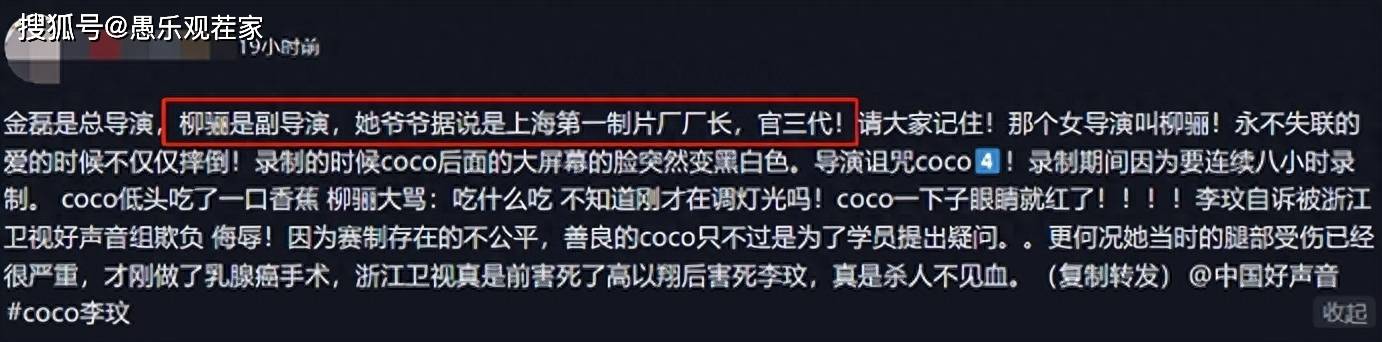 有网友称,柳骊的爷爷是上海制片厂厂长,是个妥妥的公务员后代。在电视台工作多年,如今又成为好声音导演,难怪如此嚣张。