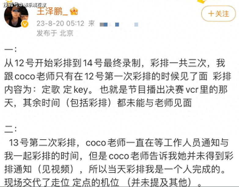 王泽鹏先是详细叙述了当时与coco合作彩排的过程,看得出来他对比赛当时的流程记得很清楚。据悉,俩人在舞台上合作的歌曲是《永不失联的爱》,这首歌到现在依旧是热门。