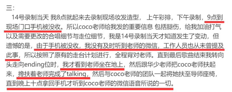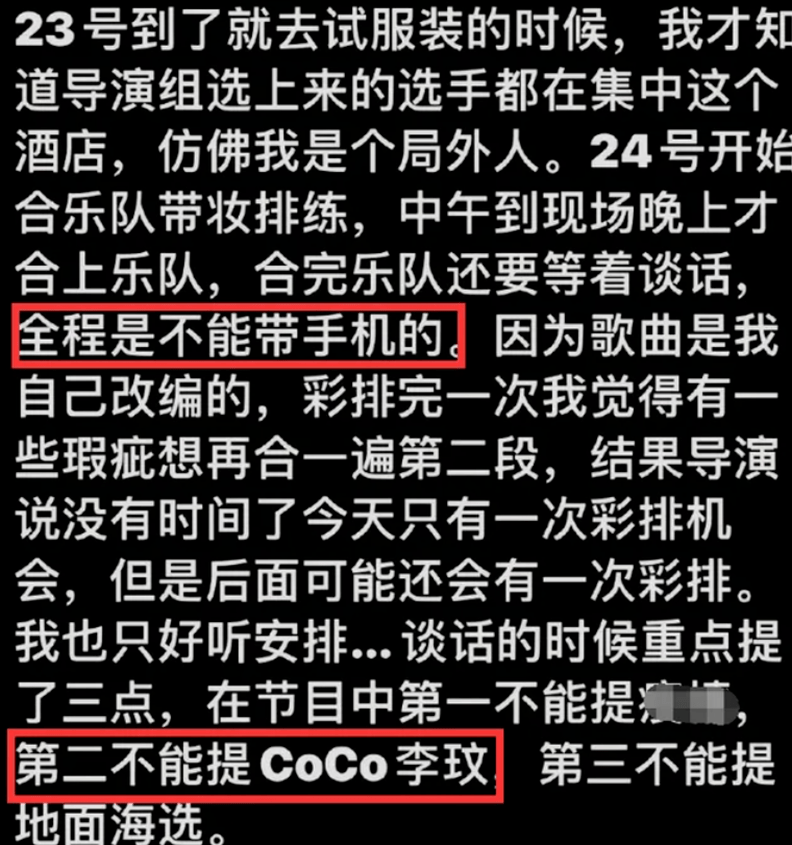 此外他的爆料中也提及了节目录制全程不能带手机,也不能提coco。