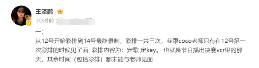 王泽鹏在长文中重点罗列了4点说明,但信息量却很大。第一点,是他与李玟在决赛前仅彩排过一次,完成了定歌和定key,但他表示彩排一共3次,其余时间他都未能与李玟再次见面。