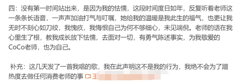 最后王泽鹏在第四点中坦承没有第一时间出来发声,是因为自己的怯懦,这段时间自己心里也是十分愧疚,悔恨自己的不细心,没有窥见这件事的端倪。