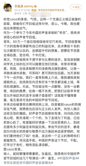 其实除了王泽鹏,最近还有多名好声音学员站出来爆料,比如李嘉捷就爆料了50万一个座位不是空穴来风,总决赛前十名的名次是可以买的。