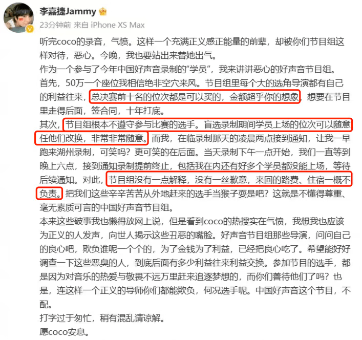 一名《好声音》的前学员前1分钟还在支援李玟录音说法。