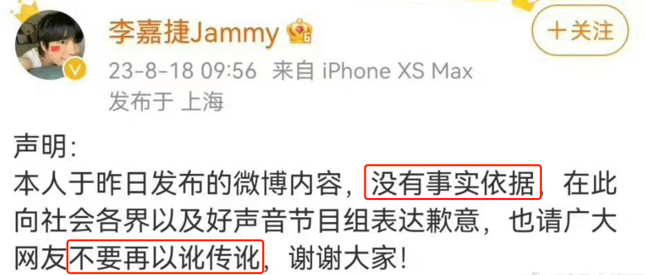 后1分钟便删除微博,并且还为综艺节目道歉。声称自己是胡编乱造。