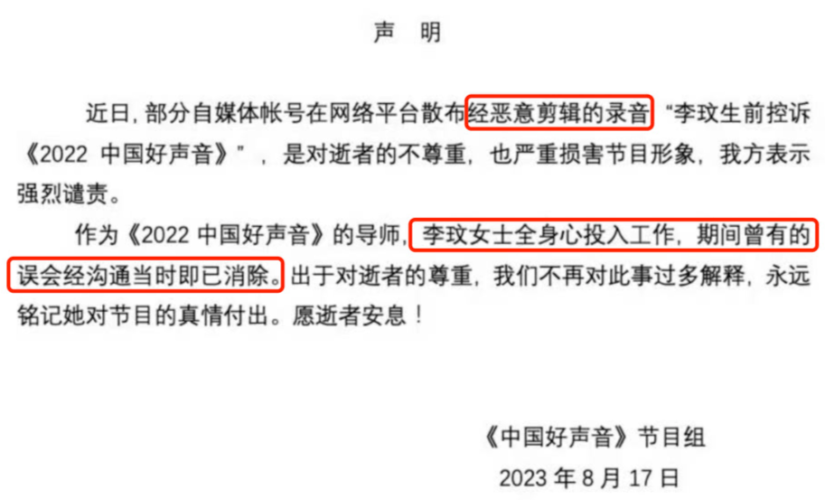“最后一天彩排,我跟泽鹏(李玟的学员)说一定要站在我的旁边,我的腿撑不了这么久,我把X光给他们看了,导演组都答应了。但是演出的时候他们把泽鹏cue走了,我站不住,有人想过我的感受吗?”(录音内容)
