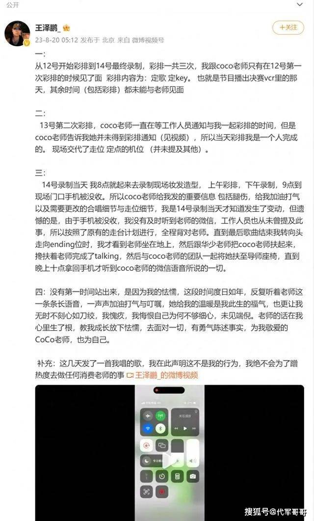 王泽鹏在发文中回顾了事件的经过。他表示,当天是录制的14号,他早上8点起床开始忙碌,准备现场妆发造型,上午进行彩排,下午录制。但他的手机在录制当天被没收,因此错过了Coco李玟老师发送的微信信息,包括舞台走位变动和她的鼓励。