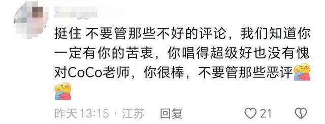 “挺住,不要管那些不好的评论,我们知道你一定有你的苦衷,你唱得超级好也没有愧对Coco老师,你很棒,不要管那些恶评。”