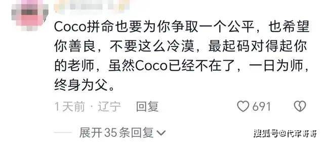 “Coco拼命也要为你争取一个公平,也希望你善良,不要这么冷漠,最起码对得起你的老师,虽然Coco已经不在了,一日为师,终身为父。”