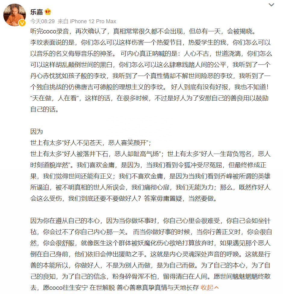 也有其他明星加入声援李玟的阵营,主持人乐嘉也站出来为李玟发声,称“真相常常很久都不会出现,但总有一天,会被揭晓。”