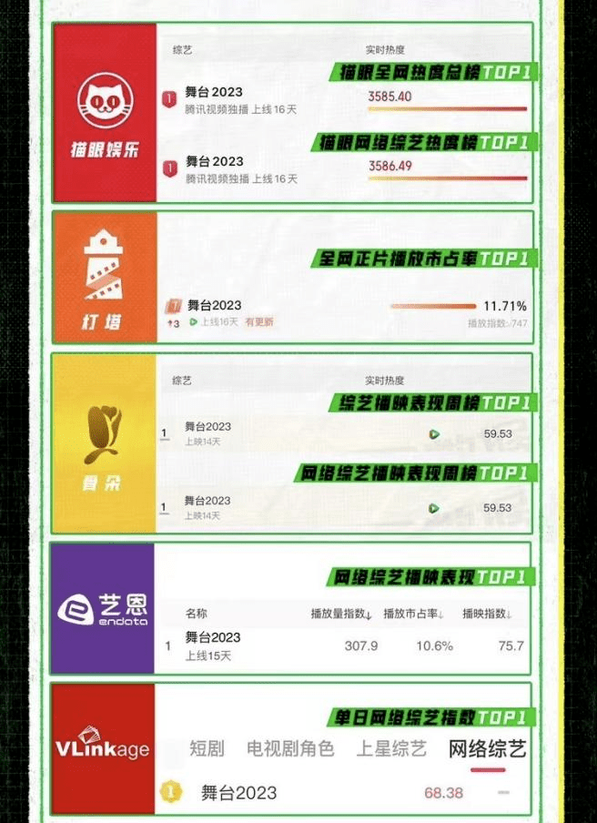 据统计,《舞台2023》播至第二期就荣登「腾讯视频必看俱乐部」并攀升至站内综艺热播榜TOP1,且每期播出后都能斩获全网好几百热搜热榜(据悉首期676个、第二期478个、第三期425个),不仅霸屏第三方监测平台榜单高位,还制造出了 #丁太升说孟美岐唱跳是国内一等#、#安崎自曝出道后失业到现在#、#孟美岐 审视我的人还没放下# 等诸多微博TOP1热点话题。