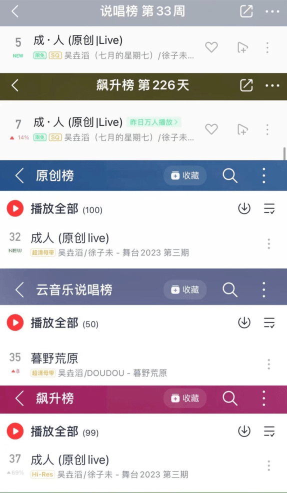 而一些新人歌手也在节目中收获更多关注,比如张郁梓凭借内测舞台《精卫》,在短视频平台播放量破亿,B站登陆全站热门,达成首个作品出圈;延展话题#建议内娱新人舞台按这个标准卷#登微博总榜TOP12,给了内娱一些新人震撼。吴垚滔在节目内演绎的两首原创《暮野荒原》《成·人》快速达成QQ音乐、网易云音乐收藏破万的成绩;《暮野荒原》歌词#长大后会明白大石碎胸口才是现实# 引发网友共鸣,登微博总榜。
