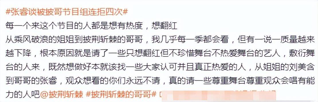 用热评的话来说:“以前的浪姐和披哥我每一集都会看,但是随着质量下降,根本原因是请了那些想翻红但不珍惜舞台的艺人。从浪姐被拒的姐姐刘美含到批哥的张睿,观众想看的节目组永远看不到。”