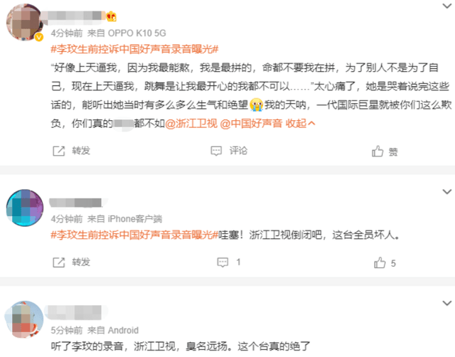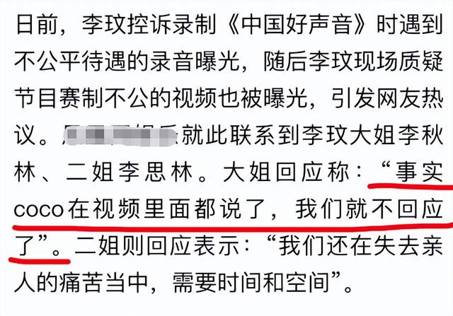 要知道就在《中国好声音2023》第四期节目播出之前,李玟生前控诉《好声音》录音以及录制现场争执视频曝光了,录音内容是李玟声音颤动带着哭腔讲述自己在录制《好声音》过程中遭受到不公正待遇,视频内容是李玟情绪激动含泪斥责节目组不公平。