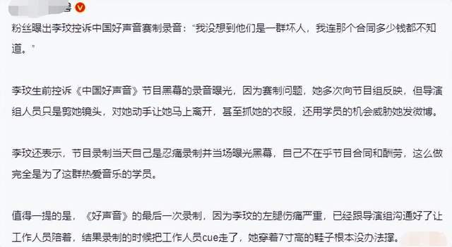 有网友梳理了相关录音和视频,做出了总结:在李玟腿部受伤且需要接受乳腺癌手术的情况下,《好声音》节目组和她爆发了冲突,对李玟的健康和情绪产生了负面影响。