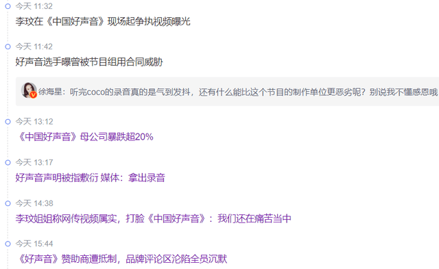 随着更多业内和《好声音》学员出面发声,《好声音》节目组、播出平台浙江卫视、《好声音》赞助商以及浙江卫视合作品牌,包括《好声音》背后资本都先后受到了质疑。