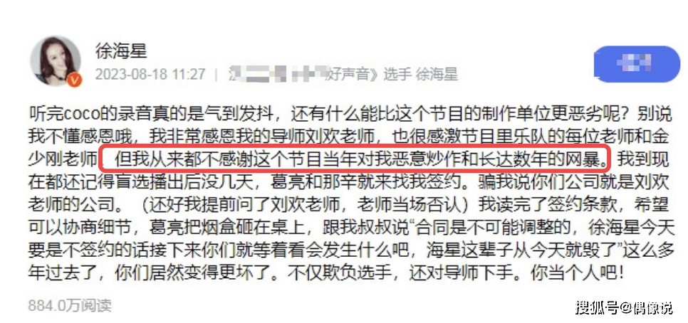 4,好声音学员徐海星爆料,导演在播出后没多久就找她签约,骗她说公司是导师的公司,不签的话就各种威胁。