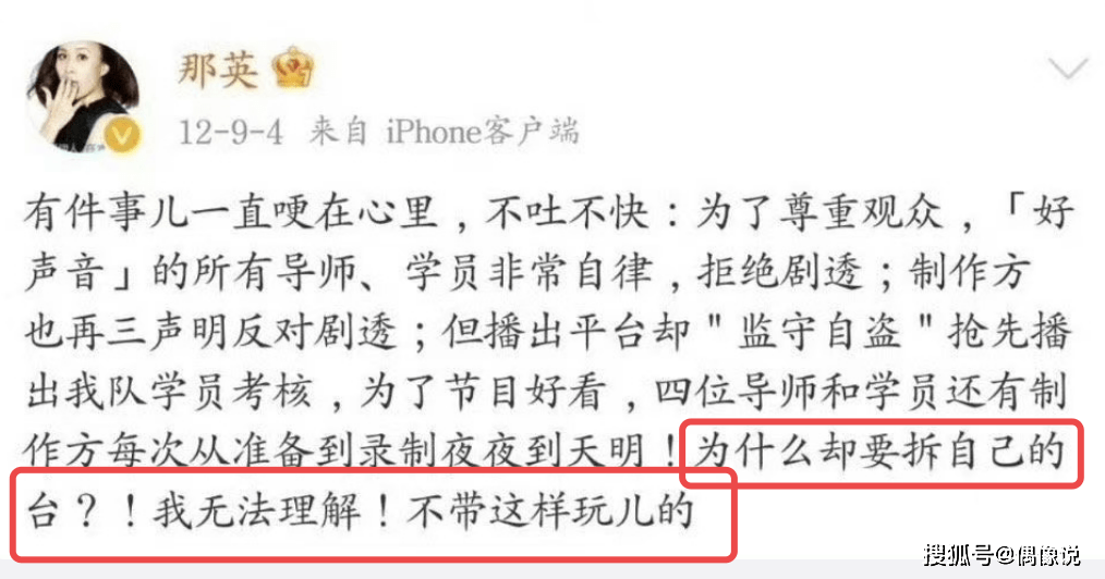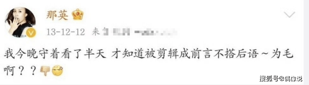 1,那英曾在12年的时候发文吐槽好声音的剪辑:为什么却要拆自己的台,我无法理解,不带这样玩的。后来13年也吐槽过。