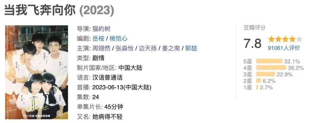 《当我飞奔向你》在优酷站内热度值高达9378,位列优酷站内热搜榜、猫眼网络剧热度榜以及豆瓣实时热门电视TOP1,于Vlinkage网络剧播放指数实现TOP3多日,全网热搜600 ,微博热搜总数260 ,微博主话题阅读30亿 。短视频平台方面,实力攻占热点340 ,抖音话题总播放量60亿,热搜共计167个;豆瓣评分从开分7.4升至7.8,实现口碑与票房双赢,传递出治愈系青春校园剧的潜力和能量。