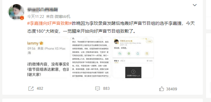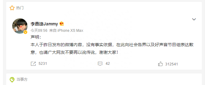 然而,让人意外的是,据爆料16小时之后,李嘉捷又发表了一篇道歉文章,表示自己没有事实依据,向社会大众以及《好声音》节目组道歉。这让人们感到非常意外,因为他的态度在短短一天之内就发生了巨大的转变。