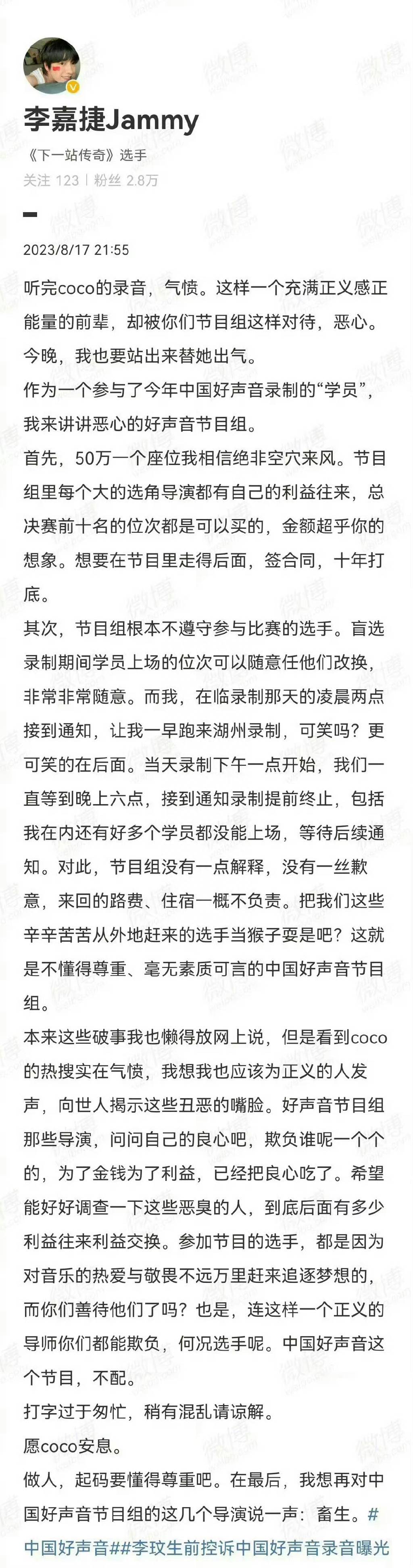 随着录音的曝光,第一个站出来发声的不是大牌明星,而是参加今年《好声音》的学员李嘉捷。他在8月17日发表了一篇长文,揭露了《好声音》的种种内幕,还在最后大骂节目组的几个导演,愤怒之情溢于言表。