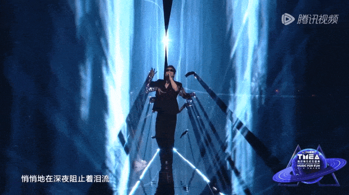 与之感觉截然相反的是满舒克的《IDK》舞台,利用激光做了视觉上可见的两面“墙”,正像歌词“黑暗的夜”“遍体鳞伤”传递出的意境那样,伴舞从激光构建的屏障中伸出手试图阻挡满舒克,却被拨开唱道:“天亮之前出发!”