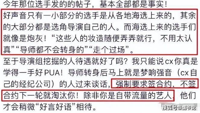 而徐海星的控诉也迎来了某些知情人的肯定,表示导师在一名学员离开之后,立即有人找到该学员,并迫使其签署合同。如果不签署合同,那么下一轮就会毫不客气地将其淘汰,除非这位学员拥有其他特殊背景。