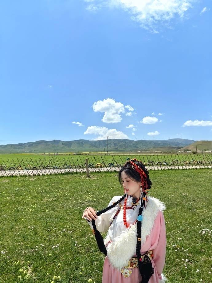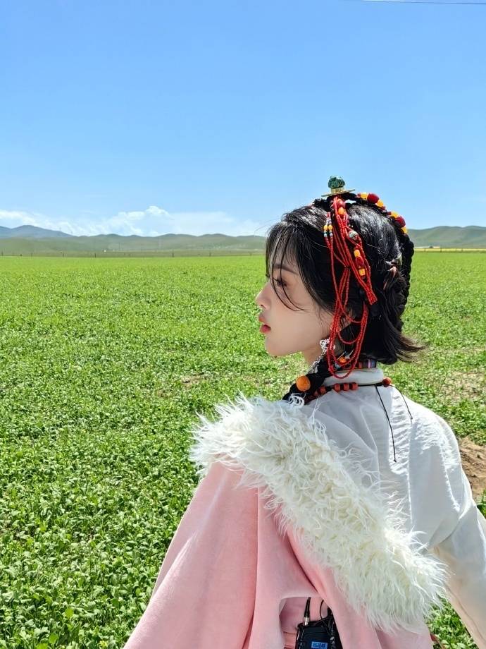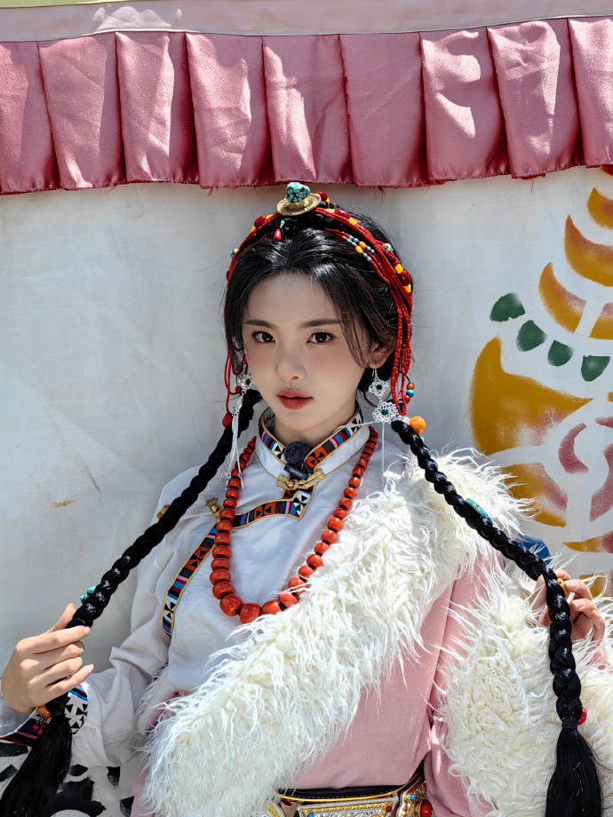 画面中的杨超越身穿藏族的服饰,还配上了许多特有的装饰品,站在蒙古包前面凹造型,双手抓着自己的麻花辫,一副特别乖巧可爱的模样,瞬间化身成为了草原的女儿。