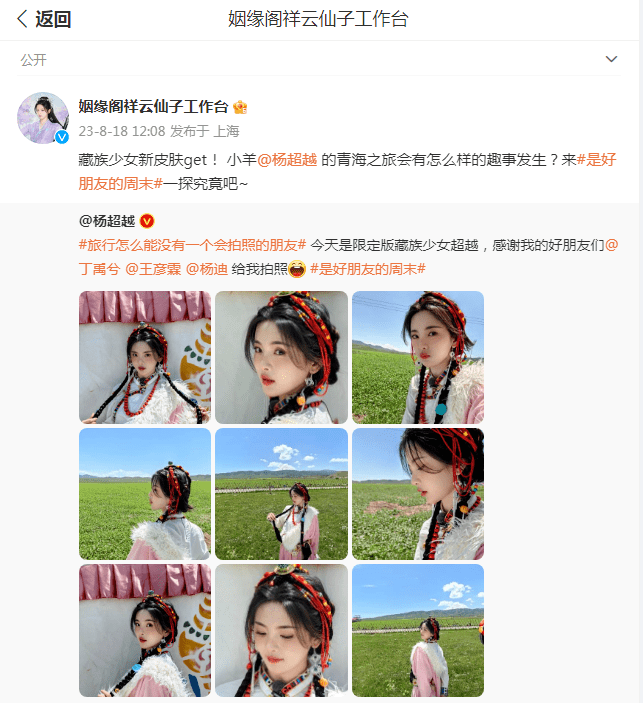 8月18日中午,杨超越在个人的社交平台上分享了一组九宫格美照,不仅表示今天是限定版藏族少女超越,而且还特意艾特了丁禹兮、王彦霖、杨迪,感谢他们给自己拍照。虽然这是她为新综艺《是好朋友的周末》宣传,但是也依旧受到了网友们的广泛关注。