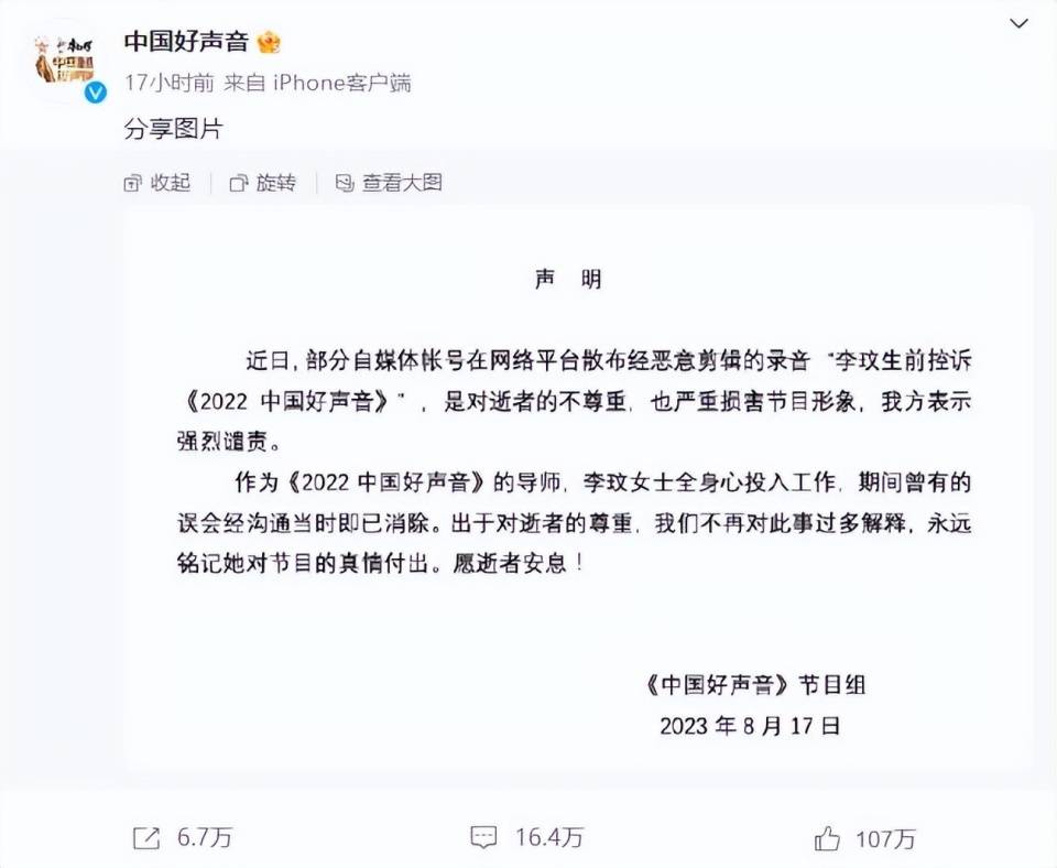 现如今看来,李玟老公的这份声明,不太像是在针对李思林,更像是在给《中国好声音》引火。
