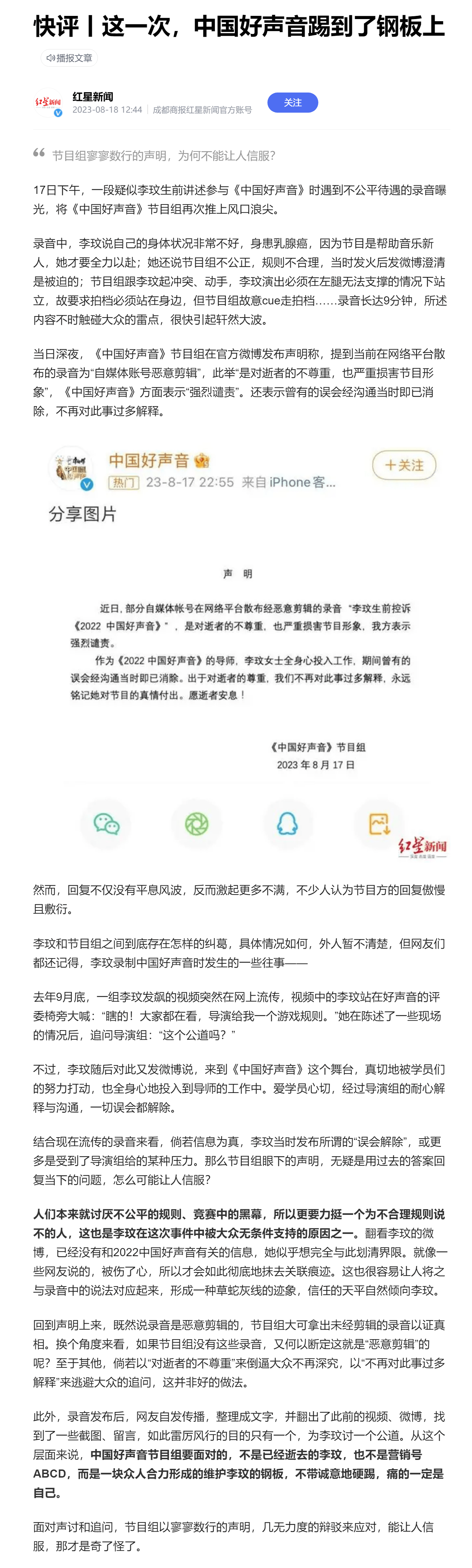 对于好声音来说,历经十几年,有着自己的一套成熟规则体系,虽然屡遭争议,但是每一次都能化险为夷,平安度过。当然这一次,事情变得不再那么简单,因为李玟的离世,更多不为人知的信息被曝光,让好声音难以再像之前那样度过了。