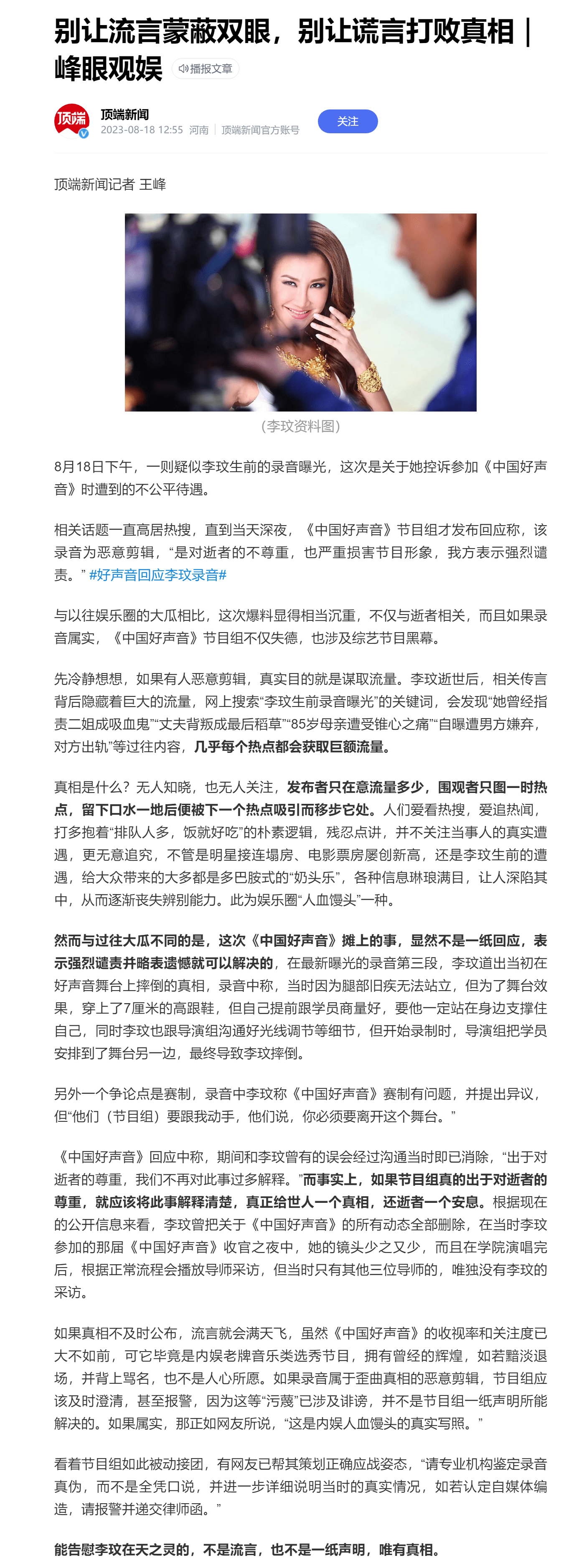 就在2023好声音最新一期节目播出前一天,一段长达九分钟的李玟控诉中国好声音的录音曝光,再次把《中国好声音》推向了风口浪尖。