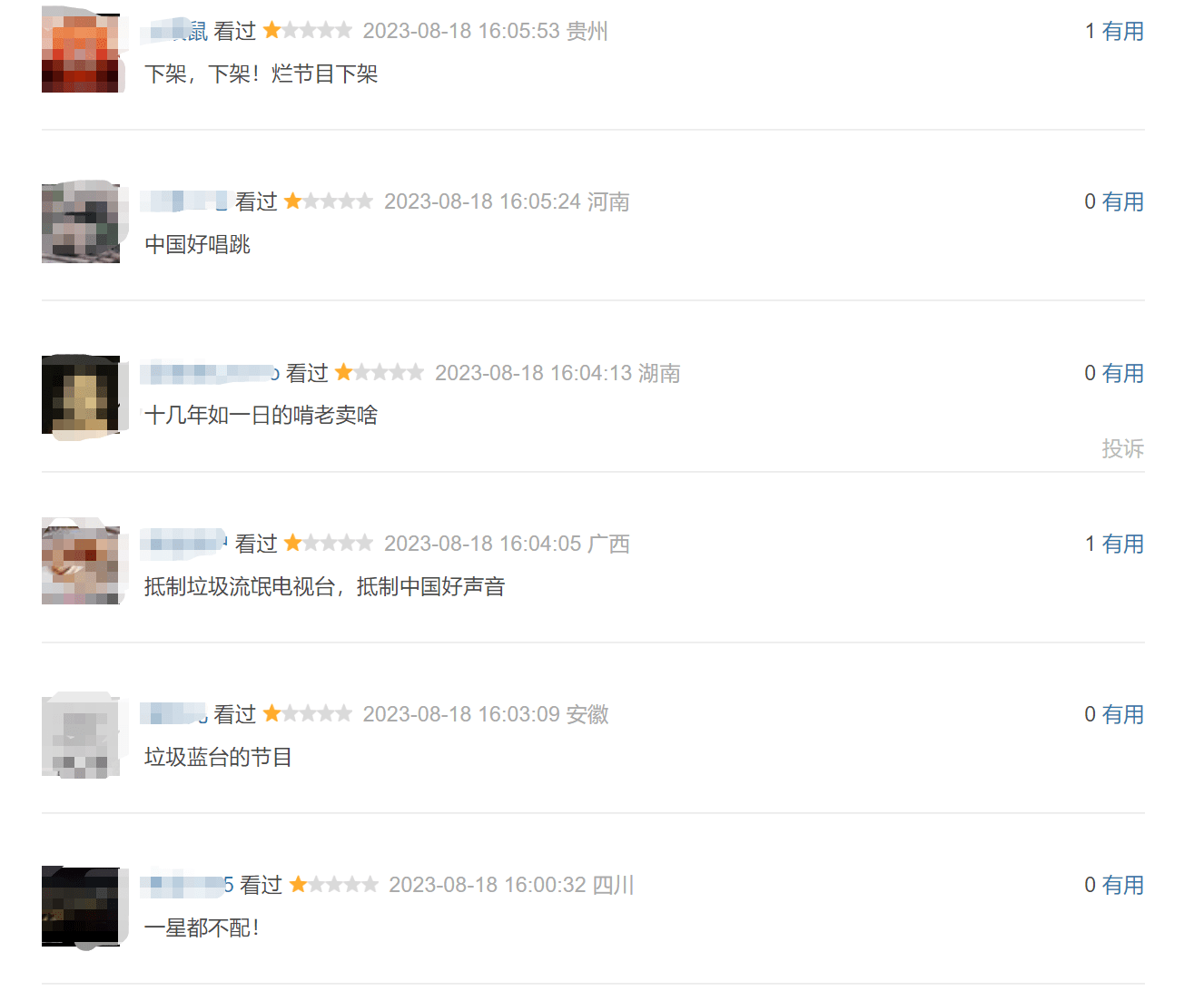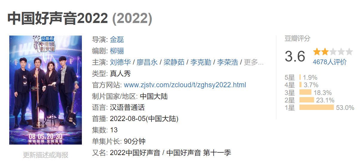 随着事件影响,2022好声音豆瓣评分已经跌至3.6分,2023好声音大量差评涌现。