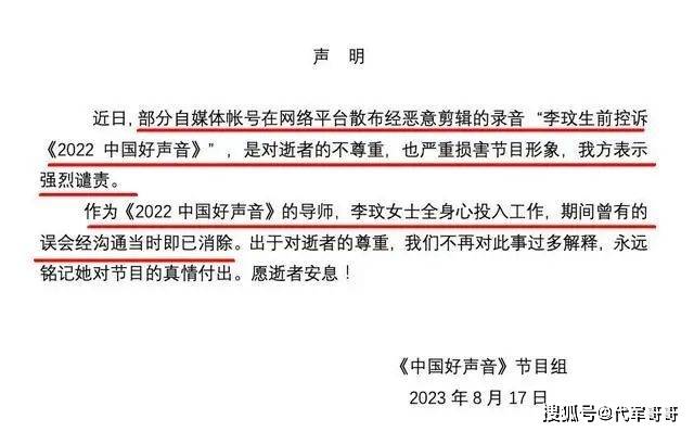 声明表示,“李玟生前控诉《2022 中国好声音》”的录音是经过恶意剪辑的,这是对逝者的不尊重,也严重损害了节目形象,对于这种行为强烈谴责。