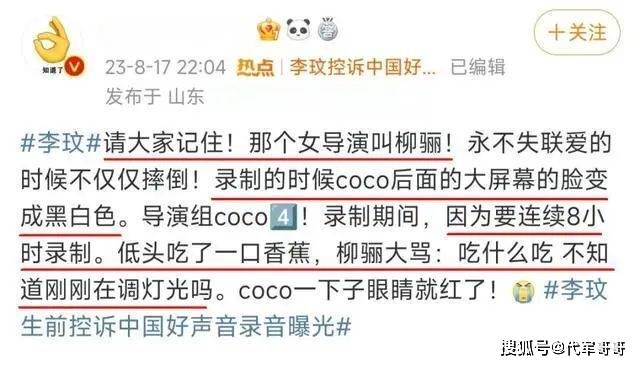 有网友透露,李玟在决赛舞台上不仅摔倒,录制的时候后面的大屏幕还成了黑白色。还有,8个小时的录制过程中,李玟只低头吃了一口香蕉,就被柳骊怒斥:“吃什么吃,不知道刚刚在调灯光吗?”