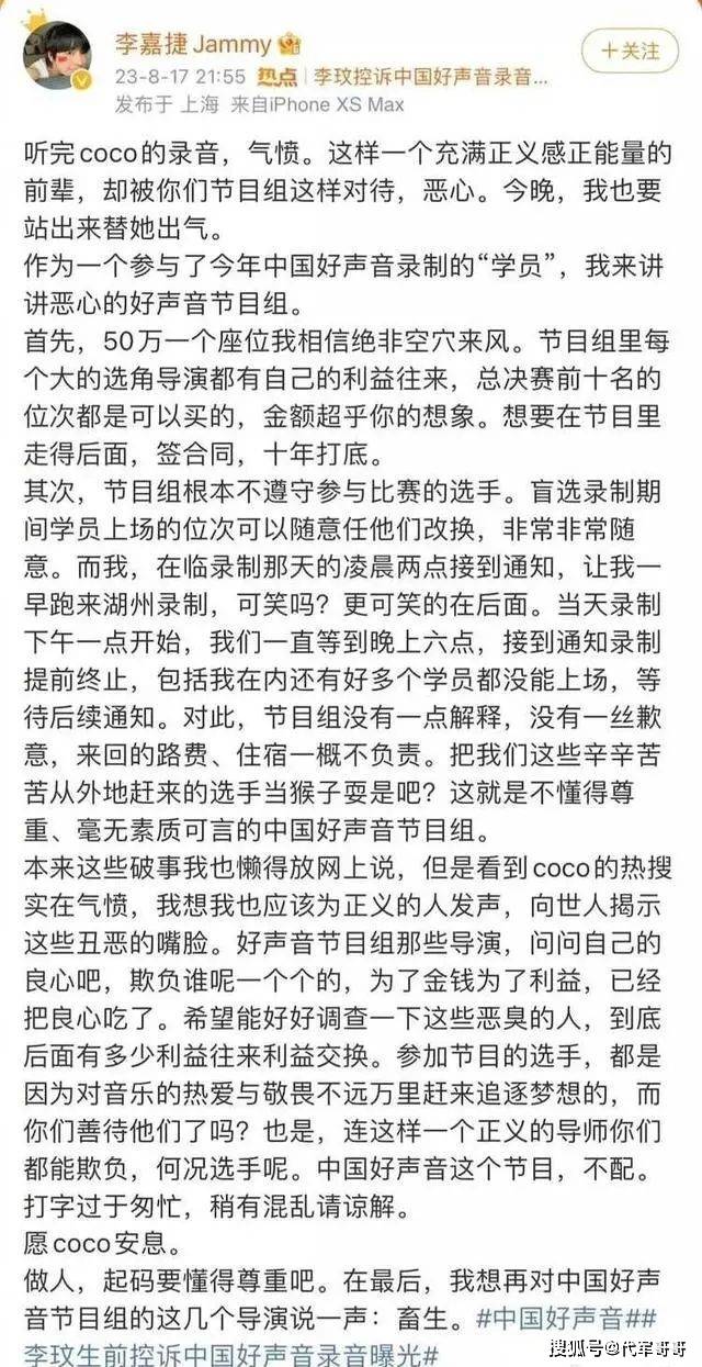 一名叫李嘉捷的选秀歌手也发微博透露节目的骚操作。她也是参加《中国好声音》的学员。