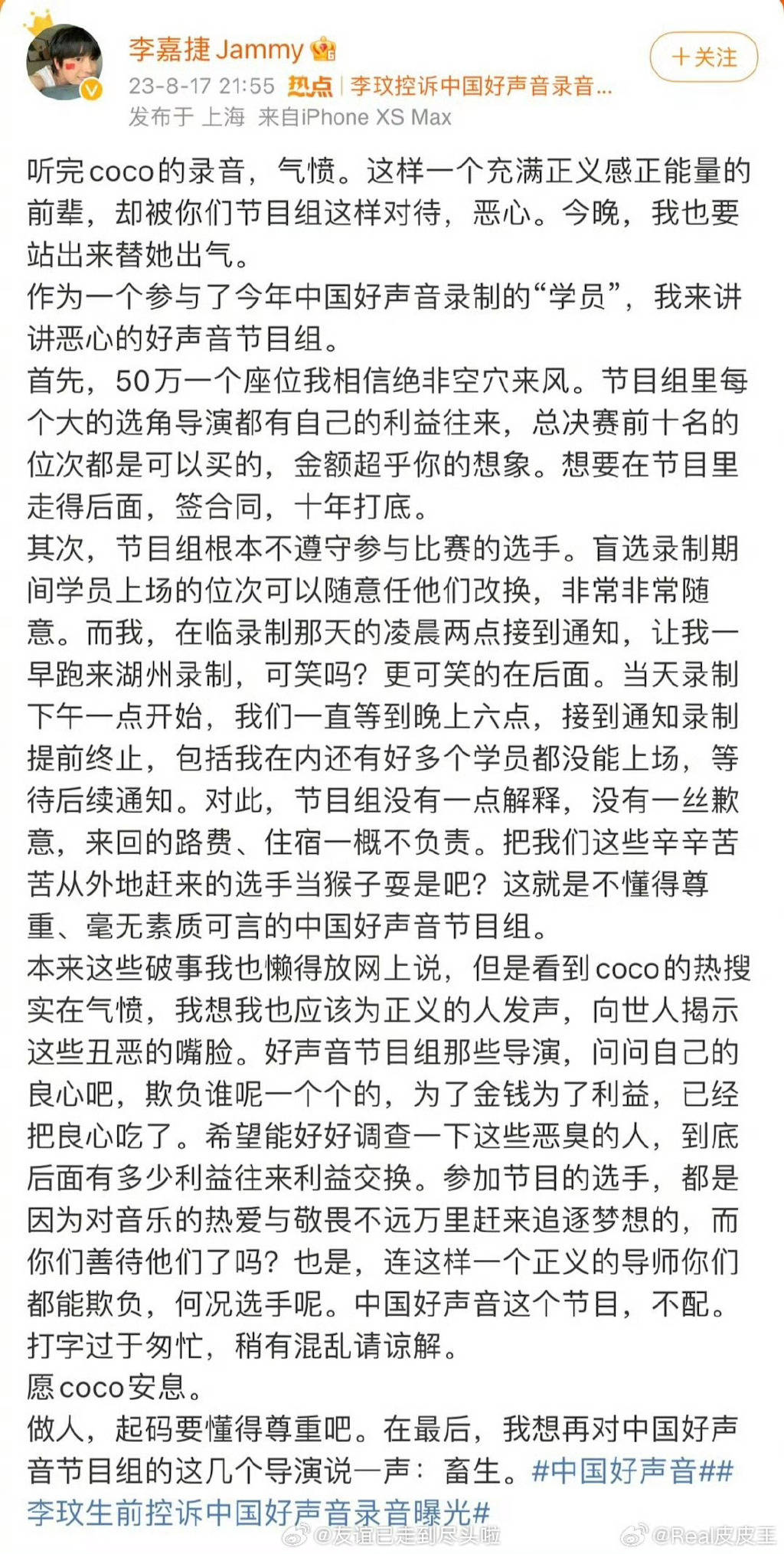 9分钟录音曝光后,曾参加过节目的艺人李嘉捷发长文,控诉节目组黑幕,称“50万一个座位”确有其事,总决赛前十名的位次都是可以买的,金额超乎想象。而想要在节目里走到后面,则要签合同,期限是十年打底。此外还控诉节目组不遵守参与比赛的选手等等。