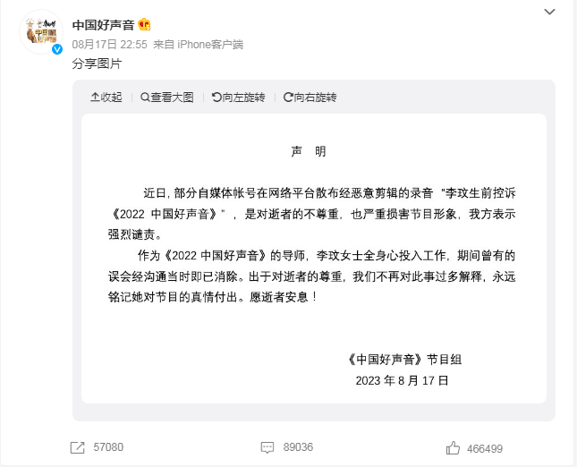 作为《2022中国好声音》的导师,李玟女士全身心投入工作,期间曾有的误会经沟通当时即已消除。出于对逝者的尊重,我们不再对此事过多解释,永远铭记她对节目的真情付出。愿逝者安息!