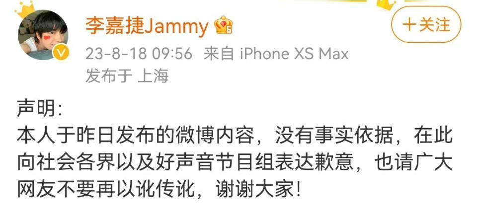 搜狐娱乐讯 8月18日,为李玟发声的《中国好声音》学员李嘉捷道歉了,称自己发的微博内容没有事实依据,”本人于昨日发布的微博内容,没有事实依据,在此向社会各界以及好声音节目组表达歉意,也请广大网友不要再以讹传讹,谢谢大家! “