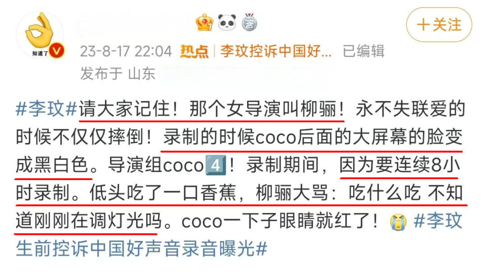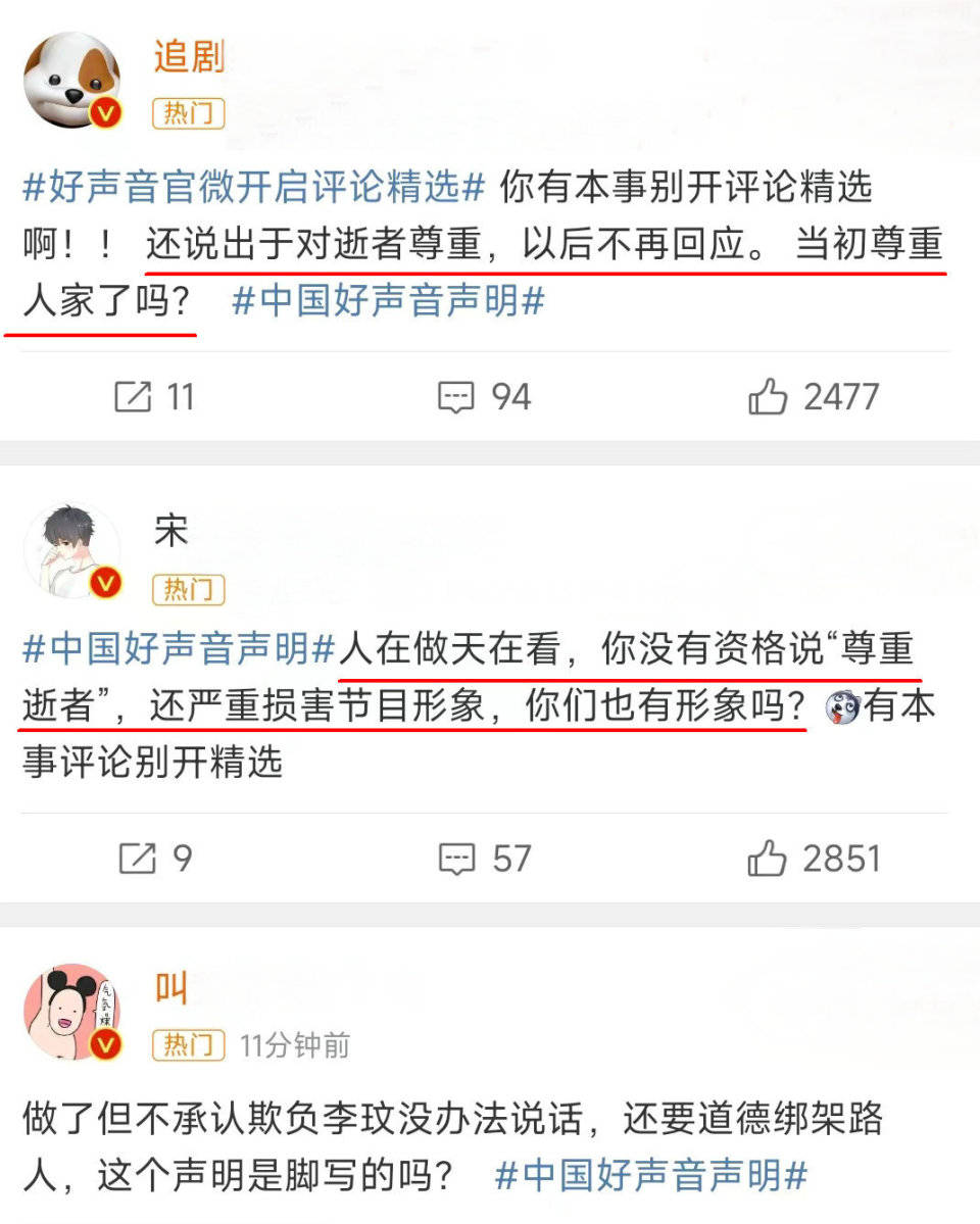 录音曝光后,无数人涌进《中国好声音》节目组官微,想要为李玟鸣不平,结果发现由于该官微设置了“评论精选”,所以无法留言。
