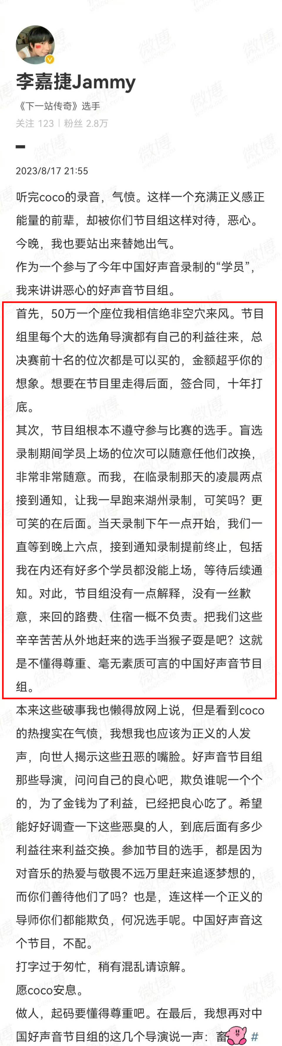 李嘉捷总结说,《中国好声音》节目毫无素质,嘲讽该节目组的导演们没有良心可言。