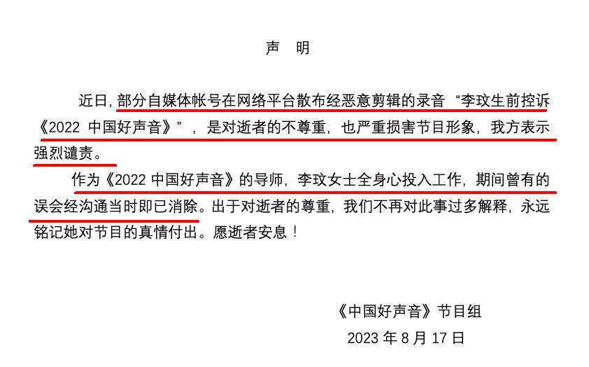 声明表示,“李玟生前控诉《2022 中国好声音》”的录音是经过恶意剪辑的,这是对逝者的不尊重,也严重损害了节目形象,对于这种行为强烈谴责。