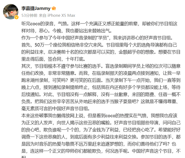 一位中国好声音的选手李嘉捷也是站出来为李玟发声,谈到了很多关于参加中国好声音的细节,其中有些内容也是让人感到触目惊心。