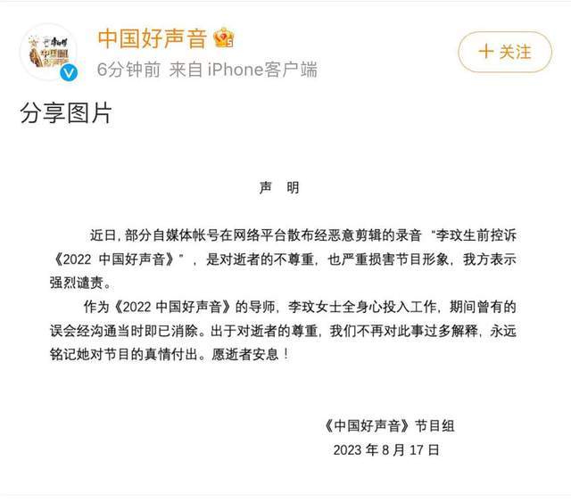 好声音官方还表示“出于对逝者的尊重,我们不再对此事过多解释,永远铭记她对节目的真情付出。愿逝者安息!”