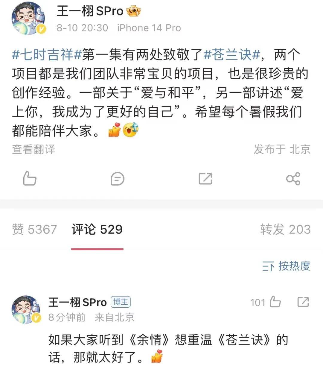 作为暑期档冲刺阶段爱奇艺拿出的S 剧,无论平台还是出品公司恒星引力,都有意复刻去年的《苍兰诀》,剧中BGM还套用了《苍兰诀》的配乐《余情》。尤其是恒星引力方面,创始人王一栩作为制片人亲自发博制造话题“第一集有两处致敬了苍兰诀”。