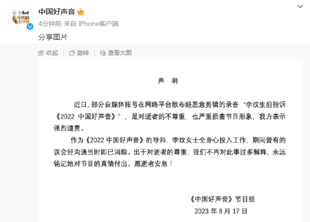 搜狐娱乐讯 8月17日,《中国好声音》官方发布声明称:“近日,部分自媒体帐号在网络平台散布经恶意剪辑的录音“李玟生前控诉《2022中国好声音》”,是对逝者的不尊重,也严重损害节目形象,我方表示强烈谴责。作为《2022中国好声音》的导师,李玟女士全身心投入工作,期间曾有的误会经沟通当时即已消除。出于对逝者的尊重,我们不再对此事过多解释,永远铭记她对节目的真情付出。愿逝者安息!”