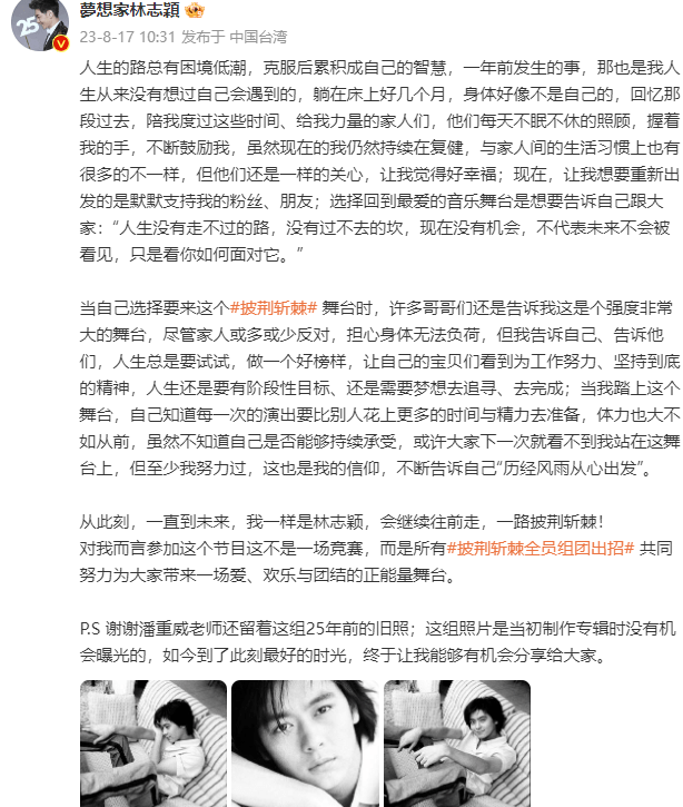 搜狐娱乐讯 8月17日,林志颖发长文并晒出25年前出道未公开旧照,并发长文回应参加《披荆斩棘》的原因。他坦言一年前发生的车祸,是从来没有想过会遇到的,“躺在床上好几个月,身体好像不是自己的,体力也大不如从前,虽然不知道自己是否能够持续承受,或许大家下一次就看不到我站在这舞台上,但至少我努力过,这也是我的信仰,不断告诉自己历经风雨从心出发”。